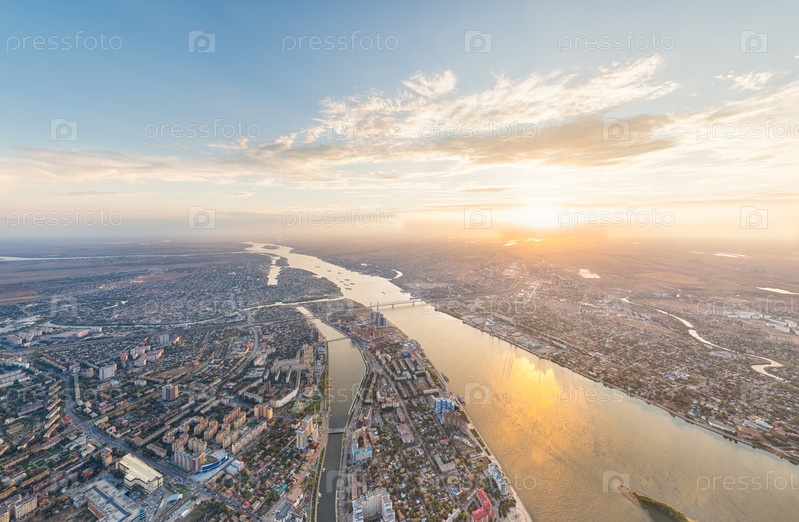 Астрахань, Россия. Панорама города с воздуха летом. Река Волга и остров Городстой. Время заката. С высоты птичьего полета