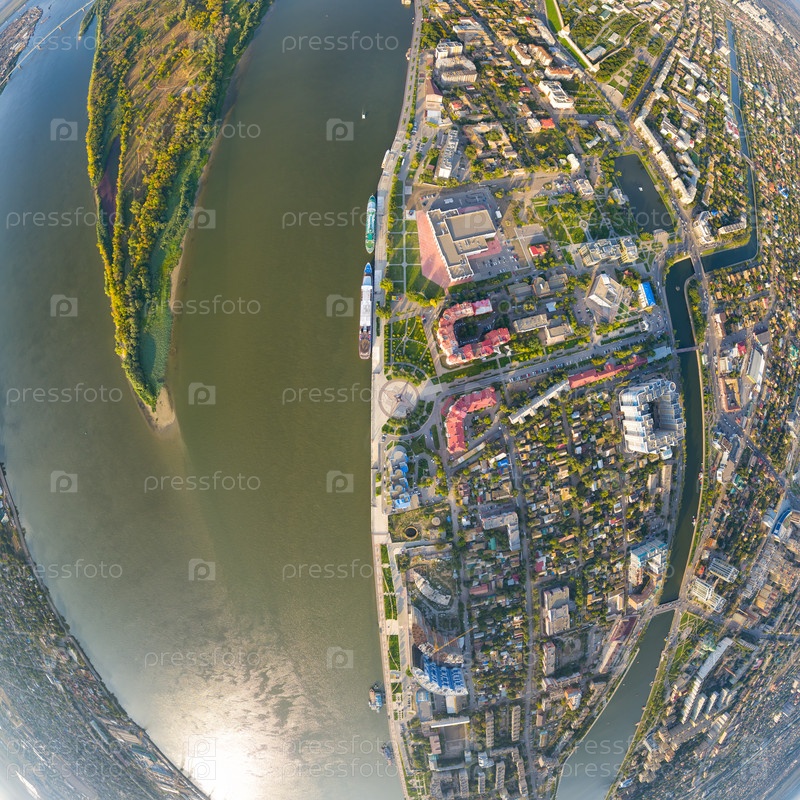 Астрахань, Россия. Панорама города с воздуха летом. Река Волга и остров Городстой. С высоты птичьего полета