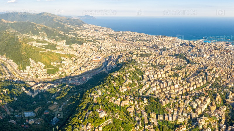 Генуя, Италия. Панорама Генуи с воздуха. Жилые районы города. С высоты птичьего полета