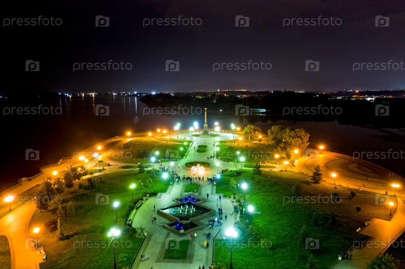 Ярославль, Россия. Вид на парк «Стрелка». Набережная реки Волги, впадение в реку Которосль. Вид с воздуха ночью