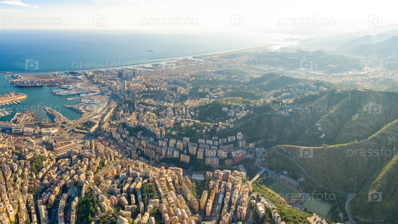 Генуя, Италия. Панорама Генуи с воздуха. Порт Генуи. С высоты птичьего полета