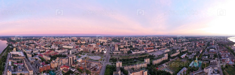 Пермь, Россия. Центральная часть города Перми. Вид на парк Пермской городской эспланады на закате. С высоты птичьего полета