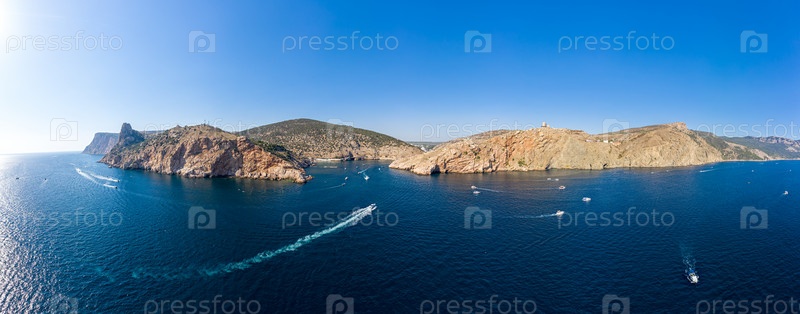 Севастополь, Крым. Вход в Балаклавскую бухту с яхт и прогулочных катеров. Панорама 360. Вид с воздуха