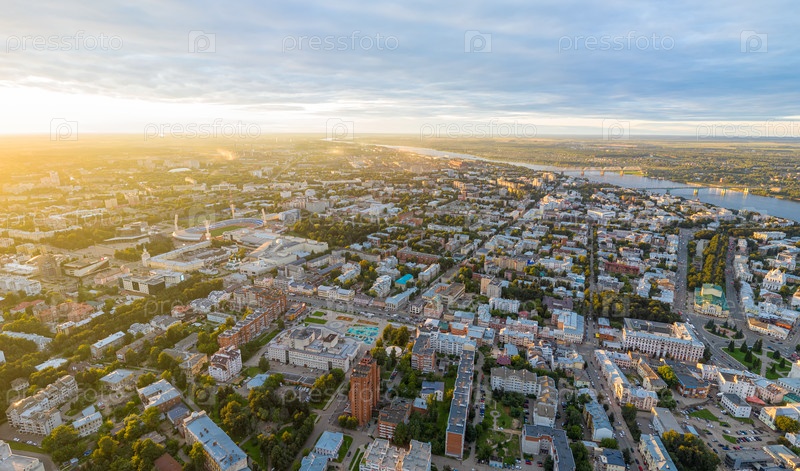 Ярославль, Россия. Исторический центр города Ярославля. Панорама. Вид с воздуха на закате. Панорама