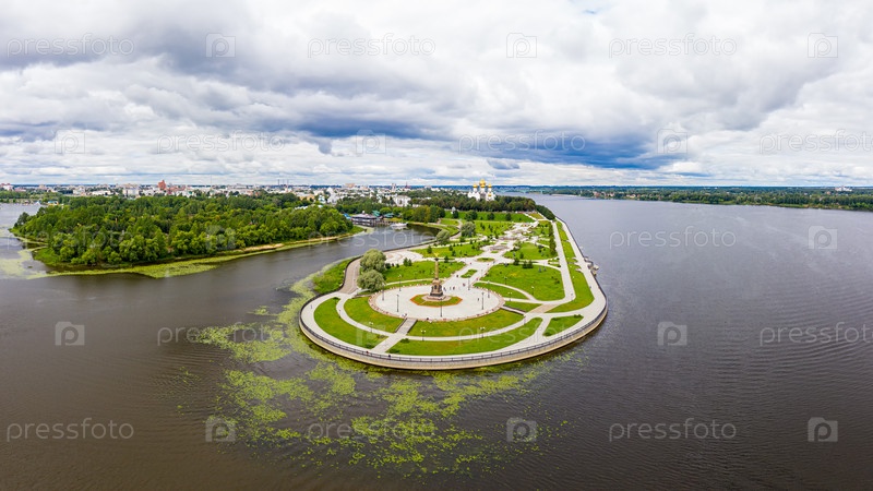 Ярославль, Россия. Стрелка, Парк на Стрелке - парк в историческом центре Ярославля. Которосль впадает в Волгу. Облачная погода. С высоты птичьего полета
