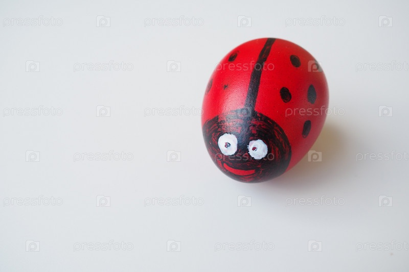 Пасхальное яйцо окрашено в красный, белый и черный цвета с веселой мордашкой божьей коровки. Вареное куриное крашеное яйцо с красной скорлупой. Белый фон. Большие глаза на веселом лице. Скопируйте пространство. Черные точки на крыльях