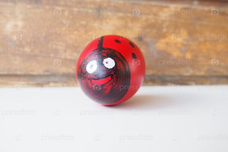 Пасхальное яйцо окрашено в красный, белый и черный цвета с веселой мордашкой божьей коровки. Вареное куриное крашеное яйцо с красной скорлупой. Белый стол деревянный фон стены. Большие глаза на веселом лице. Скопируйте пространство. Черные точки на крылья