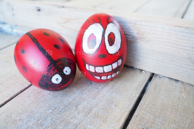 Пасхальные яйца окрашены в красный, белый и черный цвета с веселыми веселыми лицами. Вареное куриное крашеное яйцо с красной скорлупой. Пасхальное яйцо - божья коровка. Большие глаза, белые зубы на веселом антропофорном лице. Деревянный фон