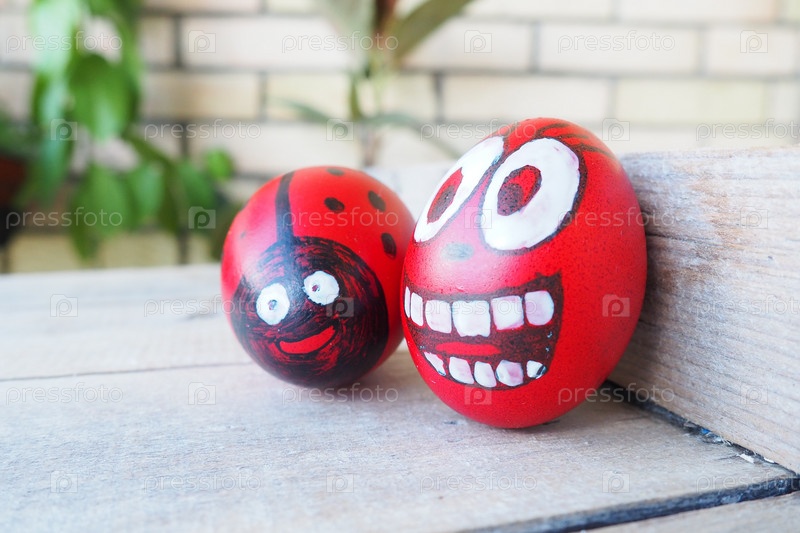 Пасхальные яйца окрашены в красный, белый и черный цвета с веселыми веселыми лицами. Вареное куриное крашеное яйцо с красной скорлупой. Пасхальное яйцо - божья коровка. Большие глаза, белые зубы на веселом антропофорном лице. Деревянный фон