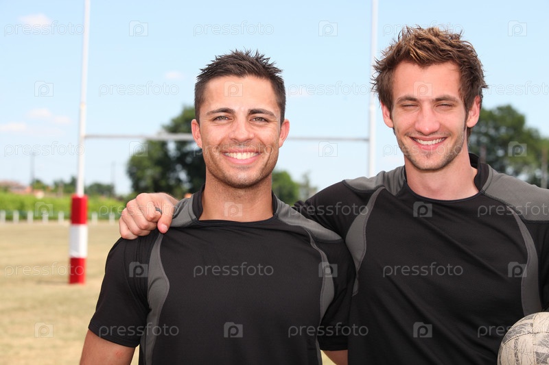 Два игрока в регби позируют с мячом перед воротами