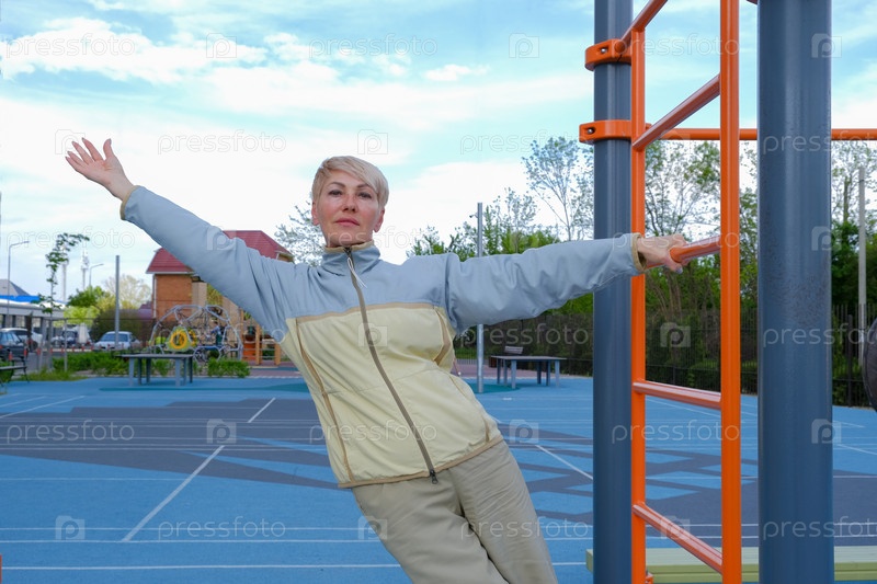 Зрелая женщина в светлом спортивном костюме занимается растяжкой на уличных тренажерах