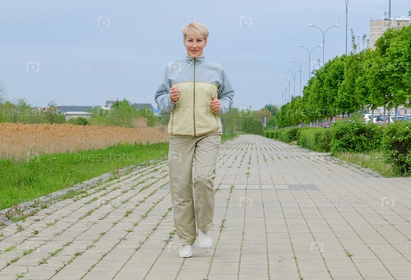 Взрослая спортивная женщина с короткой стрижкой и светлыми волосами на пробежке