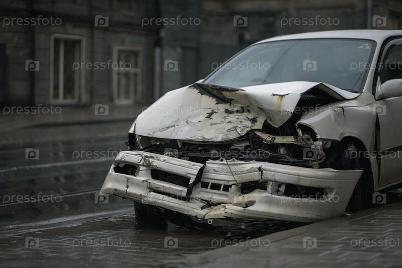 Автокатастрофа на ул. Автомобиль, поврежденный после тяжелой аварии, стоит на улице города. Концепция страхования от несчастных случаев