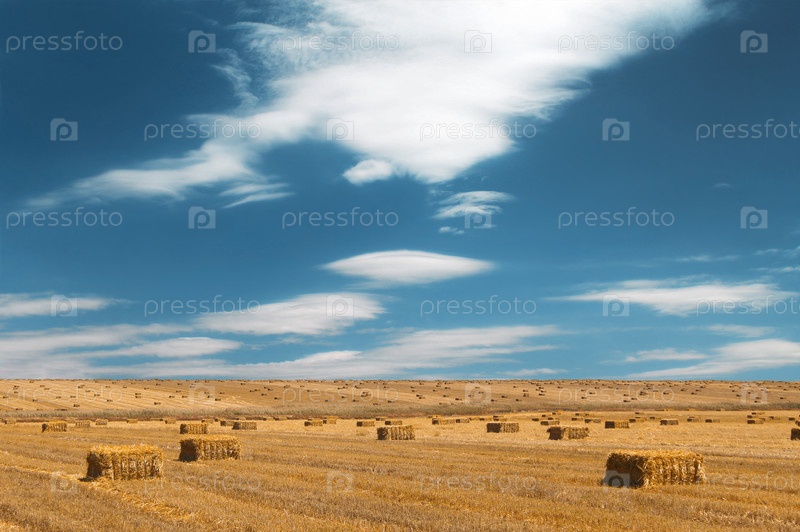 Тюковатая солома. Сено в тюках на пшеничном поле. Красивый сельский пейзаж