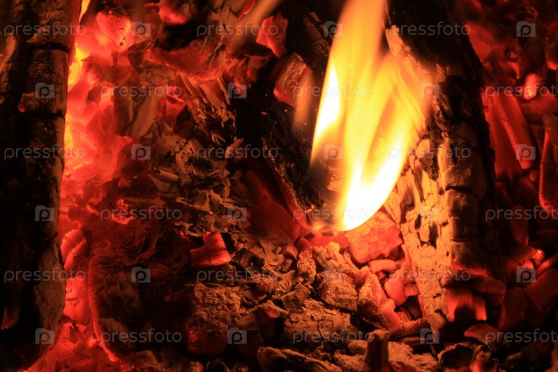 Горящие и пылающие брикеты из раскаленного угля, крупный план. Горячие угли в печи