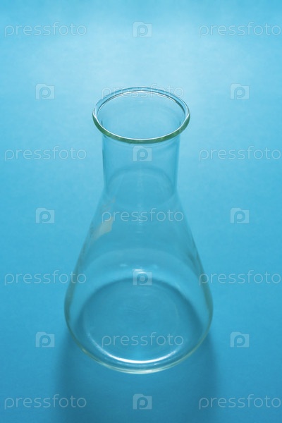 Чистая химическая колба с плоским дном на синем фоне