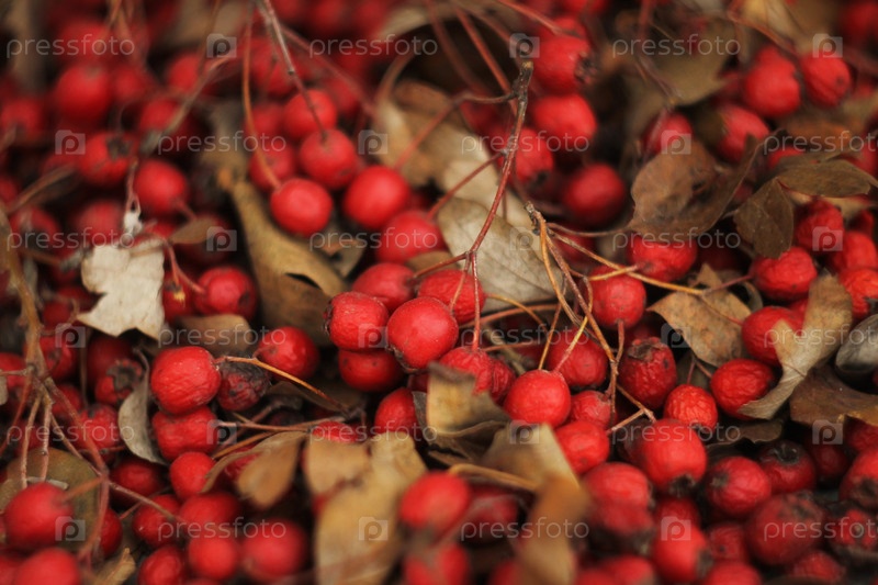 Красные спелые плоды боярышника. Пучки боярышника частично засохшие. Плоды боярышника и некоторые листья, собранные для сушки