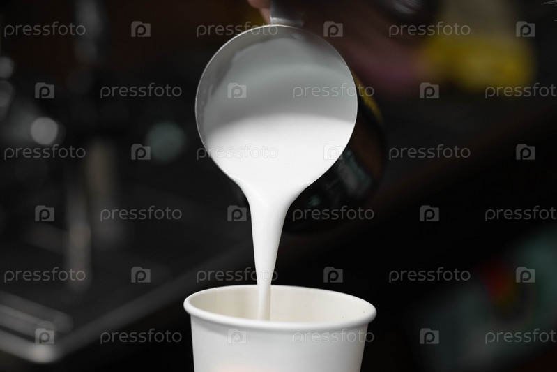 Процесс приготовления кофе на кофеварке. Горячее вспененное молоко выливается из кувшина в бумажный стаканчик