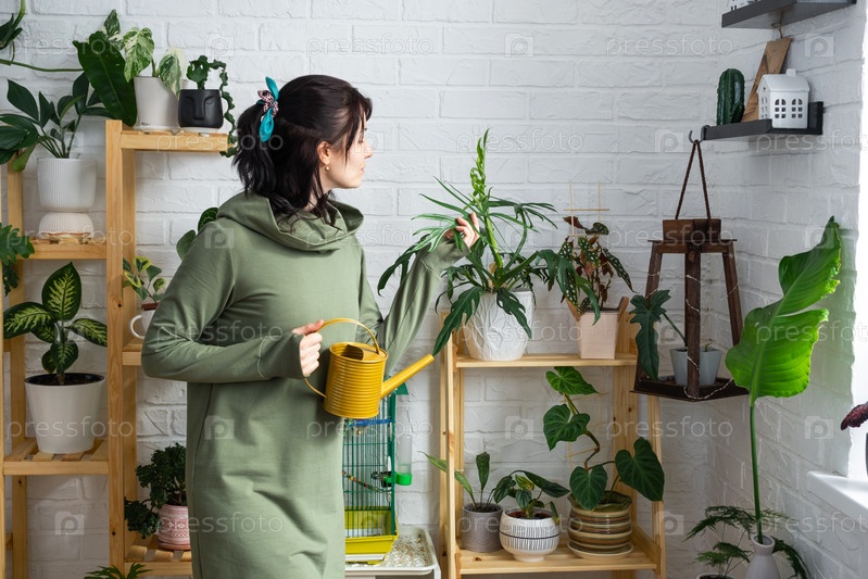 Женщина поливает домашние растения из своей коллекции редких видов из лейки, с любовью выращенной на полках в интерьере дома. Домашнее растениеводство, теплица, водный баланс