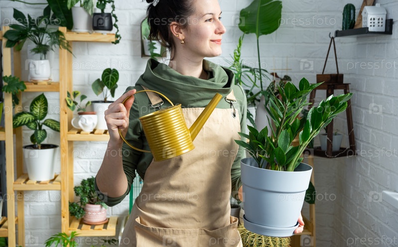 Неприхотливый и популярный замиокулькас в руках женщины в интерьере теплицы со стеллажами из коллекций домашних растений. Домашнее растениеводство, селекционер любуется кактусом в горшке