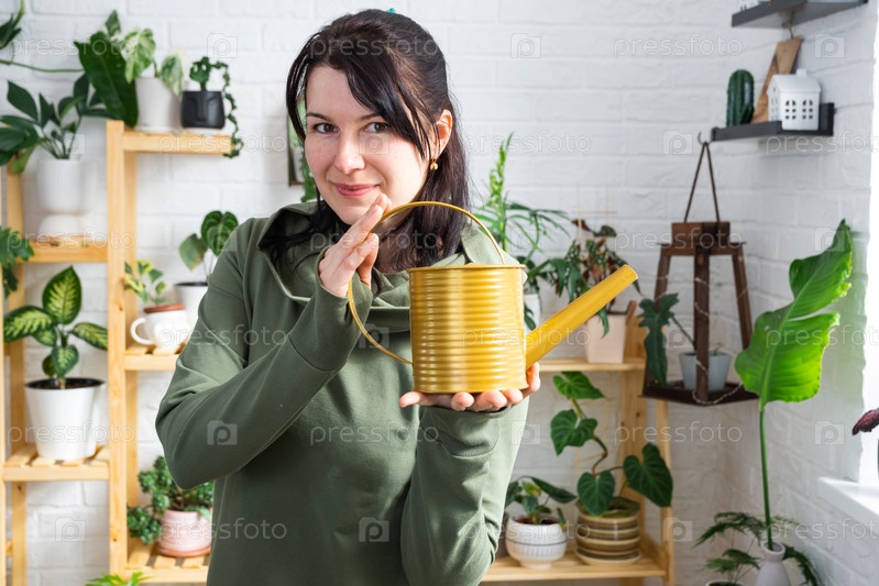 В кадр смотрит портрет женщины с интерьерной лейкой и пульверизатором для ухода за домашними комнатными растениями. Домашнее растениеводство, теплица, водный баланс