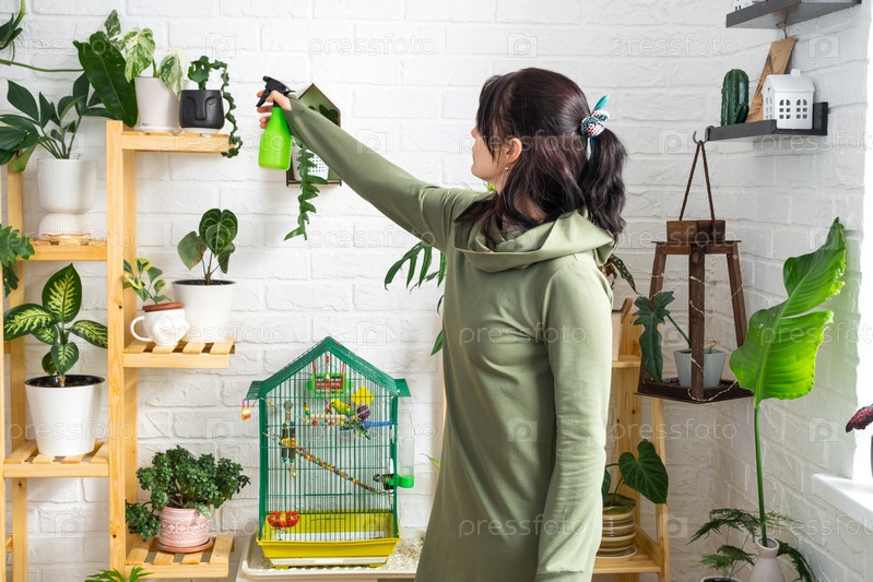 Женщина опрыскивает из пульверизатора домашние растения из своей коллекции, выращенные с любовью на полках в интерьере дома. Домашнее растениеводство, теплица, водный баланс, увлажнение