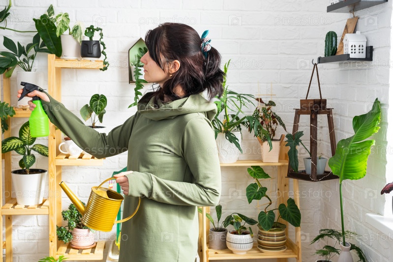 Женщина опрыскивает из пульверизатора домашние растения из своей коллекции, выращенные с любовью на полках в интерьере дома. Домашнее растениеводство, теплица, водный баланс, увлажнение