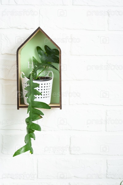 Marniera chrysocardium epiphyllum лесный кактус на полке в форме домика на стене из белого кирпича