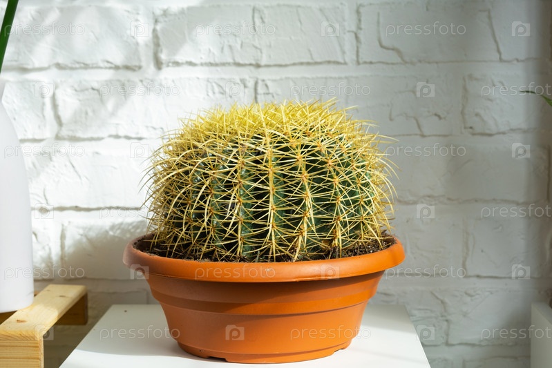 Большой эхинокактус Грузони в интерьере на фоне белой кирпичной стены. Домашнее растениеводство, большой кактус в горшке