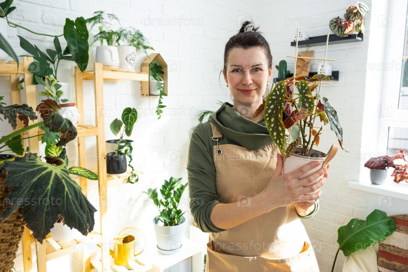 Женщина-заводчик держит в руках домашние растения в горшке из своей коллекции дома на полках. Поиск вредителей, уход, полив, удобрения. Домашнее растениеводство, портрет смотрит в рамку