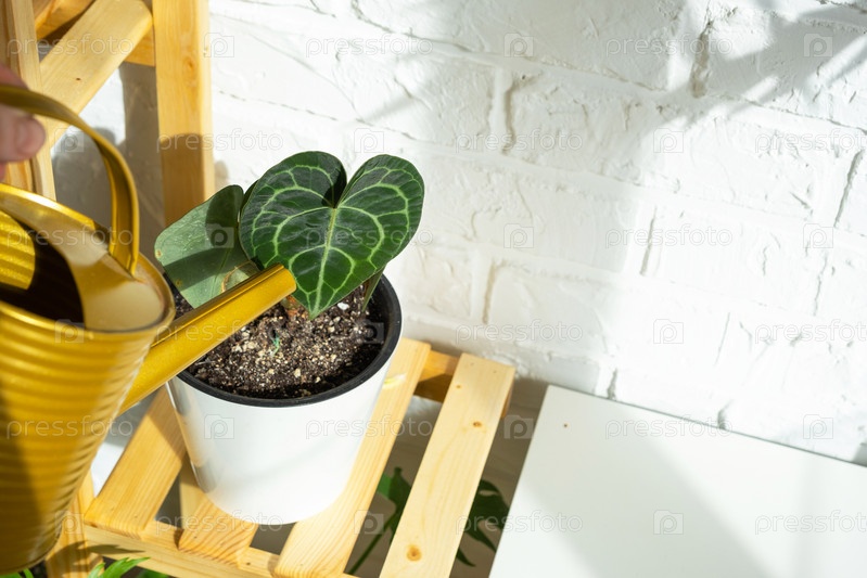 Полив из лейки домашних растений, с любовью выращенных на полках в интерьере дома. Домашнее растениеводство, теплица, водный баланс