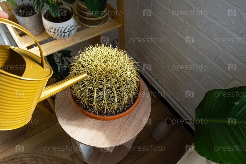 Полив из лейки домашнего растения кактуса, с любовью выращенного на полках в интерьере дома. Домашнее растениеводство, теплица, водный баланс