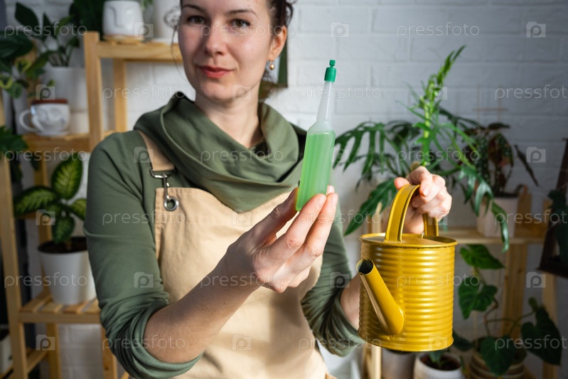 Капельное удобрение для горшечных растений, стимулятор развития, ускорение роста, уход за домашними растениями. Бутылка с жидкостью вставлена в руку женщины. Домашнее растениеводство