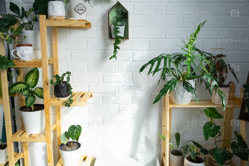 Стеллаж с группой комнатных растений в интерьере. Комнатное растение Выращивание и уход за комнатным растением, зеленый дом