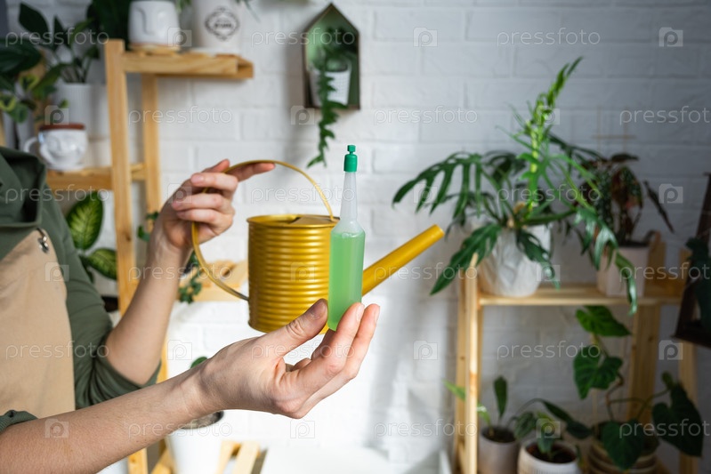 Капельное удобрение для горшечных растений, стимулятор развития, ускорение роста, уход за домашними растениями. Бутылка с жидкостью вставлена в руку женщины. Домашнее растениеводство
