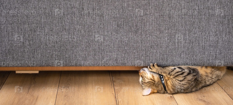 Домашняя кошка точит когти о диван. Домашнее животное портит мебель, рвет диван с антивандальным покрытием