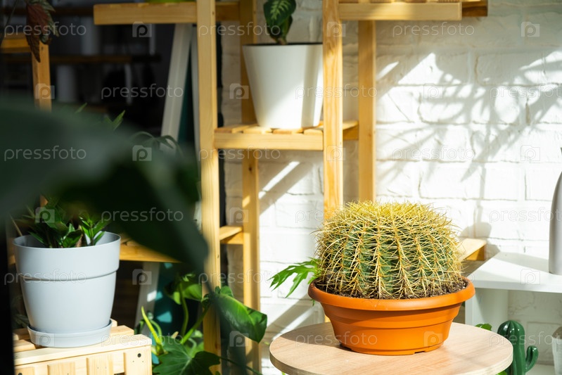 Большой эхинокактус Грузони в интерьере теплицы со стеллажами из коллекций домашних растений. Домашнее растениеводство, селекционер любуется кактусом в горшке