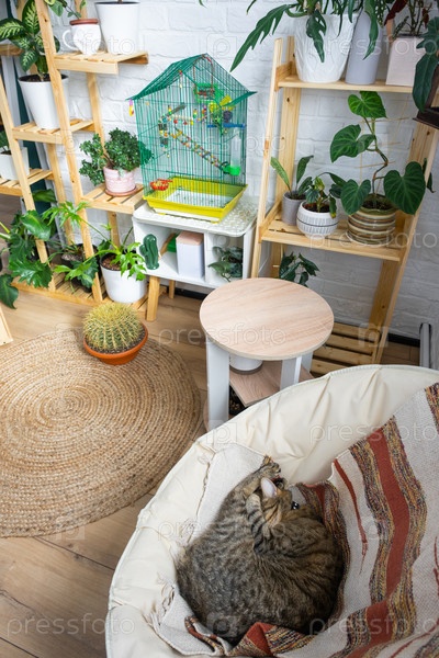 Кошка спит в кресле, а клетка с волнистым попугайчиком стоит в живом углу дома среди стеллажей с группой комнатных растений в интерьере. Комнатное растение Выращивание и уход за комнатным растением, зеленый дом