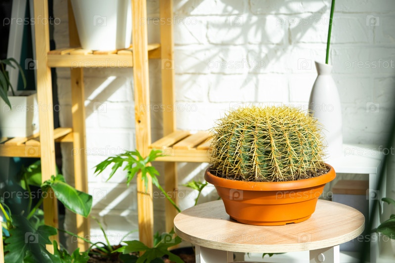 Большой эхинокактус Грузони в интерьере теплицы со стеллажами из коллекций домашних растений. Домашнее растениеводство, селекционер любуется кактусом в горшке