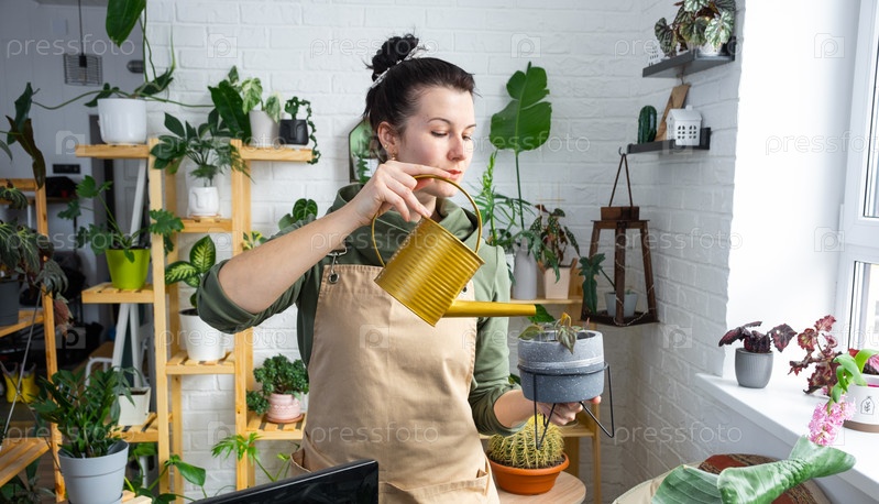 Женщина поливает домашние растения из своей коллекции редких видов из лейки, с любовью выращенной на полках в интерьере дома. Домашнее растениеводство, теплица, водный баланс
