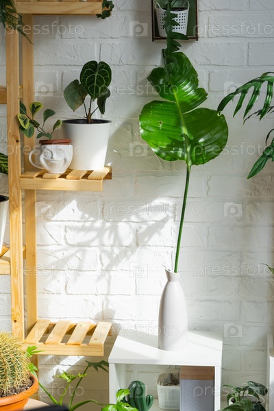 Стеллаж с группой комнатных растений в интерьере. Комнатное растение Выращивание и уход за комнатным растением, зеленый дом