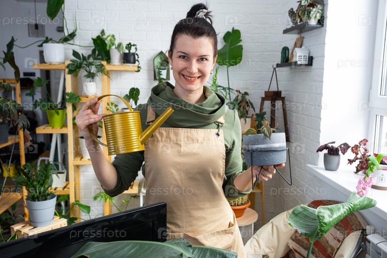 Женщина поливает домашние растения из своей коллекции редких видов из лейки, с любовью выращенной на полках в интерьере дома. Домашнее растениеводство, теплица, водный баланс
