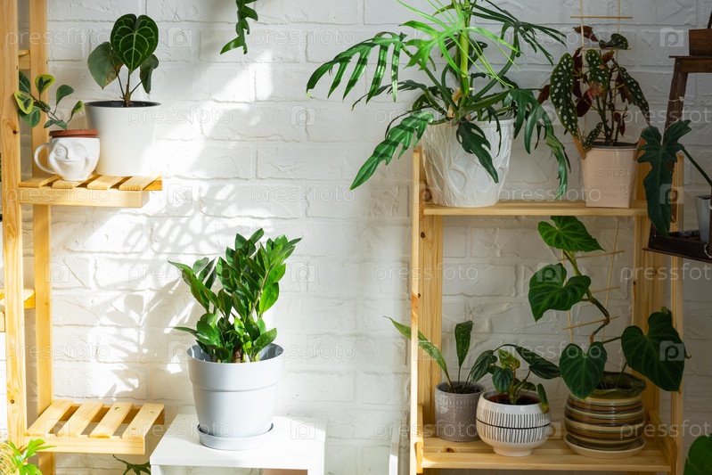Стеллаж с группой комнатных растений в интерьере. Комнатное растение Выращивание и уход за комнатным растением, зеленый дом