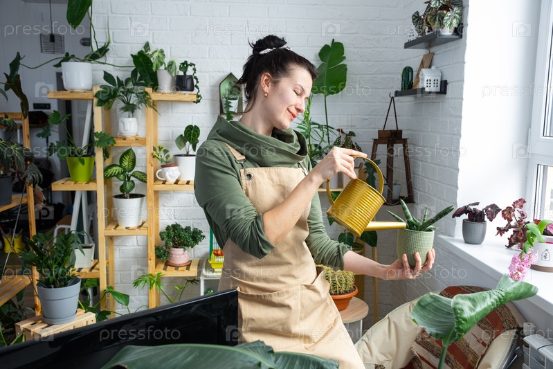 Женщина поливает домашние растения из своей коллекции редких видов из лейки, с любовью выращенной на полках в интерьере дома. Домашнее растениеводство, теплица, водный баланс
