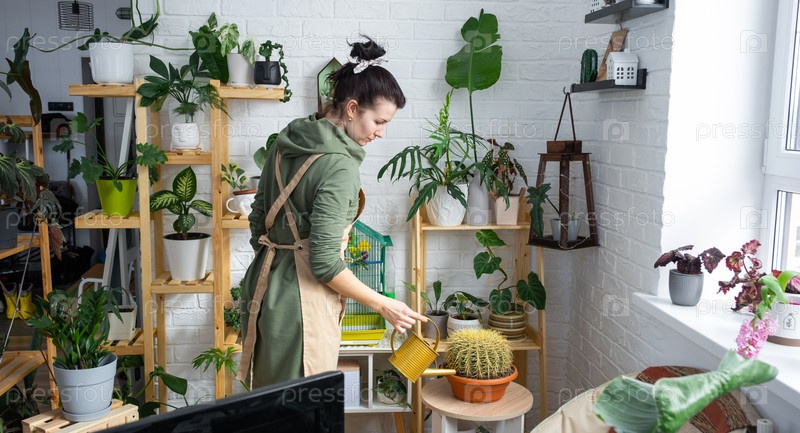 Женщина поливает домашние растения из своей коллекции редких видов из лейки, с любовью выращенной на полках в интерьере дома. Домашнее растениеводство, теплица, водный баланс
