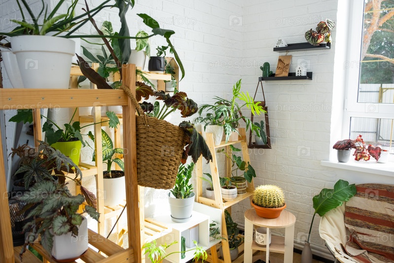 Стеллаж с группой комнатных растений в интерьере. Комнатное растение Выращивание и уход за комнатным растением, зеленый дом