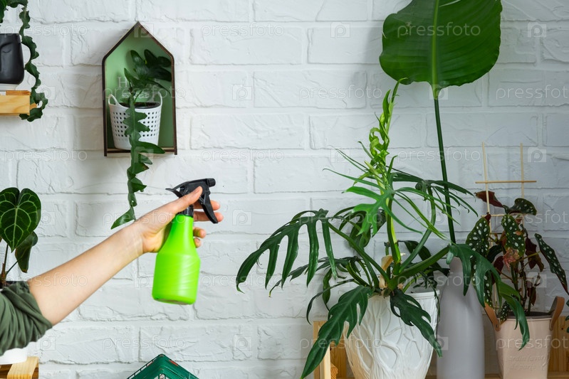 Женщина опрыскивает из пульверизатора домашние растения из своей коллекции, выращенные с любовью на полках в интерьере дома. Домашнее растениеводство, теплица, водный баланс, увлажнение