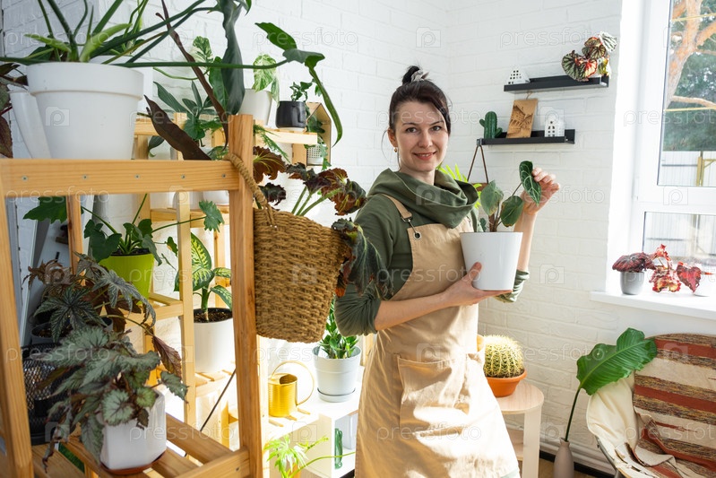 Женщина-заводчик держит в руках домашние растения в горшке из своей коллекции дома на полках. Поиск вредителей, уход, полив, удобрения. Домашнее растениеводство, портрет смотрит в рамку
