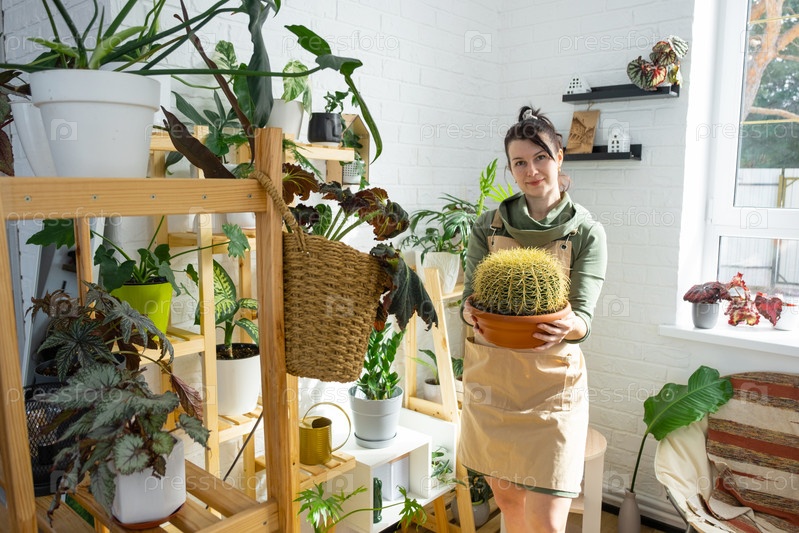 Большой эхинокактус Грузони в руках женщины в интерьере оранжереи со стеллажными коллекциями домашних растений. Домашнее растениеводство, селекционер любуется кактусом в горшке