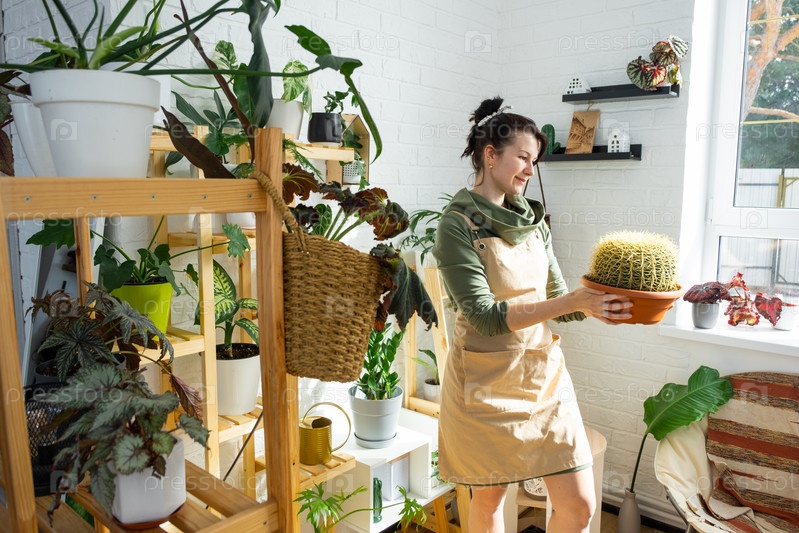 Большой эхинокактус Грузони в руках женщины в интерьере оранжереи со стеллажными коллекциями домашних растений. Домашнее растениеводство, селекционер любуется кактусом в горшке